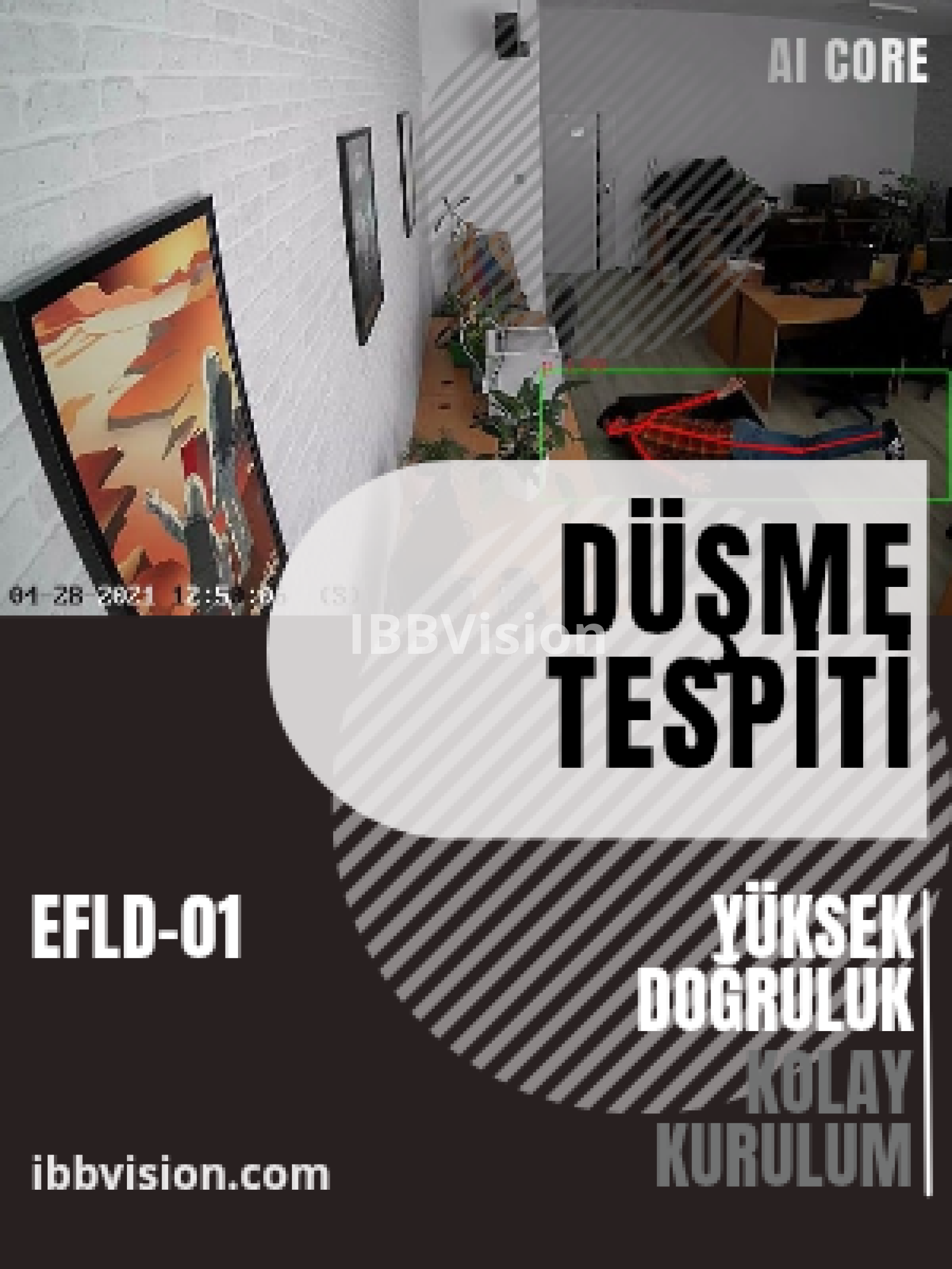 EFLD-01, kapalı ve açık alanlarda kişilerin yere düşme olaylarını, bayılma, bilinç kaybı ve acil müdahale gerektiren durumları gerçek zamanlı olarak tespit eden, Edge yapay zeka tabanlı bir video analiz yazılım modülüdür. IBBVision ekosistemi içinde çalışacak şekilde geliştirilen EFLD-01, hem tek başına bağımsız bir çözüm olarak kullanılabilir hem de daha önce tesis edilmiş IBBVision ürünlerine ek bir güvenlik katmanı olarak entegre edilebilir.