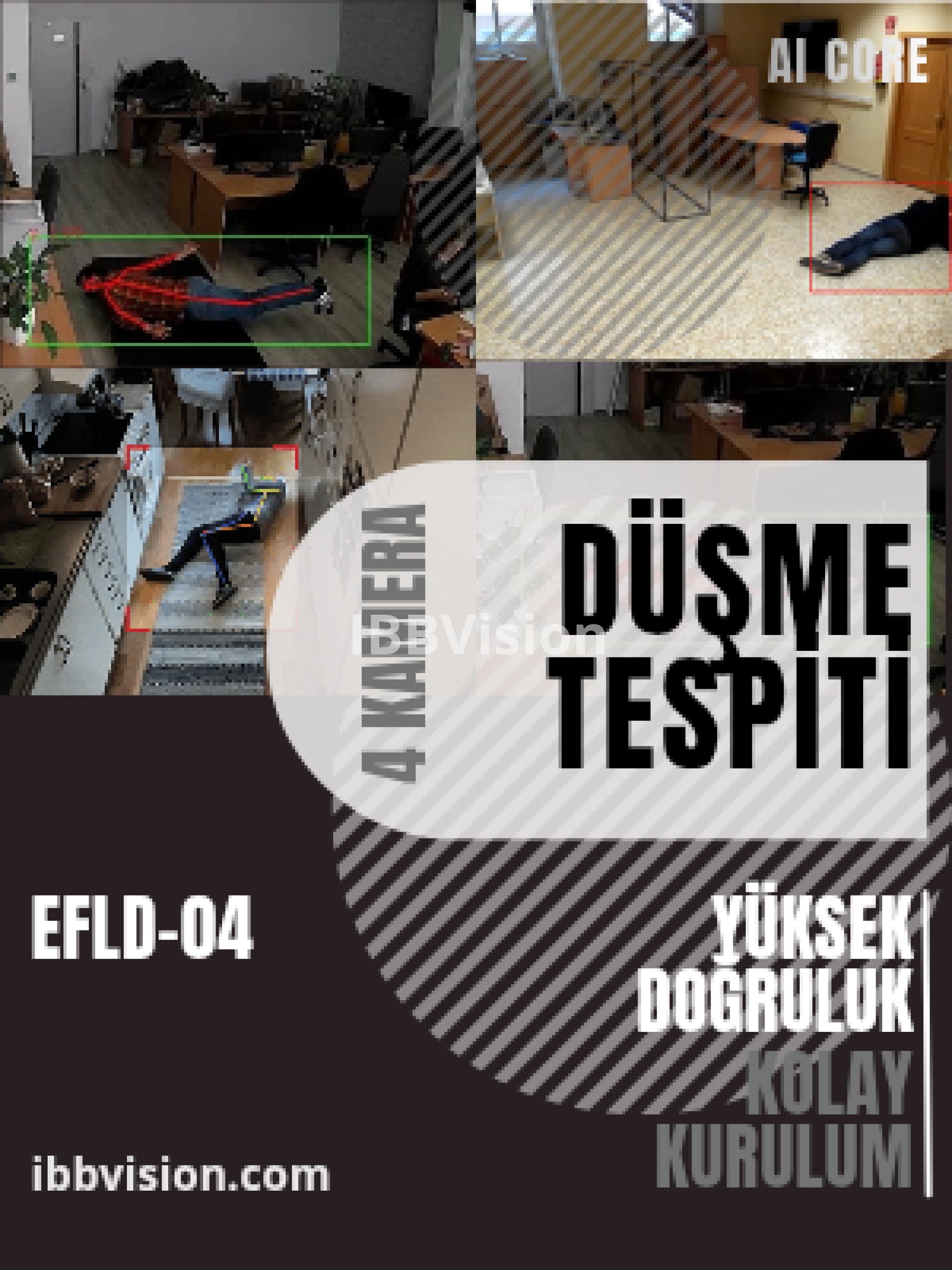 EFLD-04, kapalı ve açık alanlarda kişilerin yere düşme olaylarını, bayılma, bilinç kaybı ve acil müdahale gerektiren durumları gerçek zamanlı olarak tespit eden, Edge yapay zeka tabanlı bir video analiz yazılım modülüdür. IBBVision ekosistemi içinde çalışacak şekilde geliştirilen EFLD-04, aynı anda dört adet IP kamerayı destekleyerek geniş alanların veya birden fazla kritik noktanın tek bir Edge cihaz üzerinden yönetilmesine olanak tanır. Hem tek başına bağımsız bir çözüm olarak kullanılabilir hem de daha önce tesis edilmiş IBBVision ürünlerine ek bir güvenlik katmanı olarak entegre edilebilir.