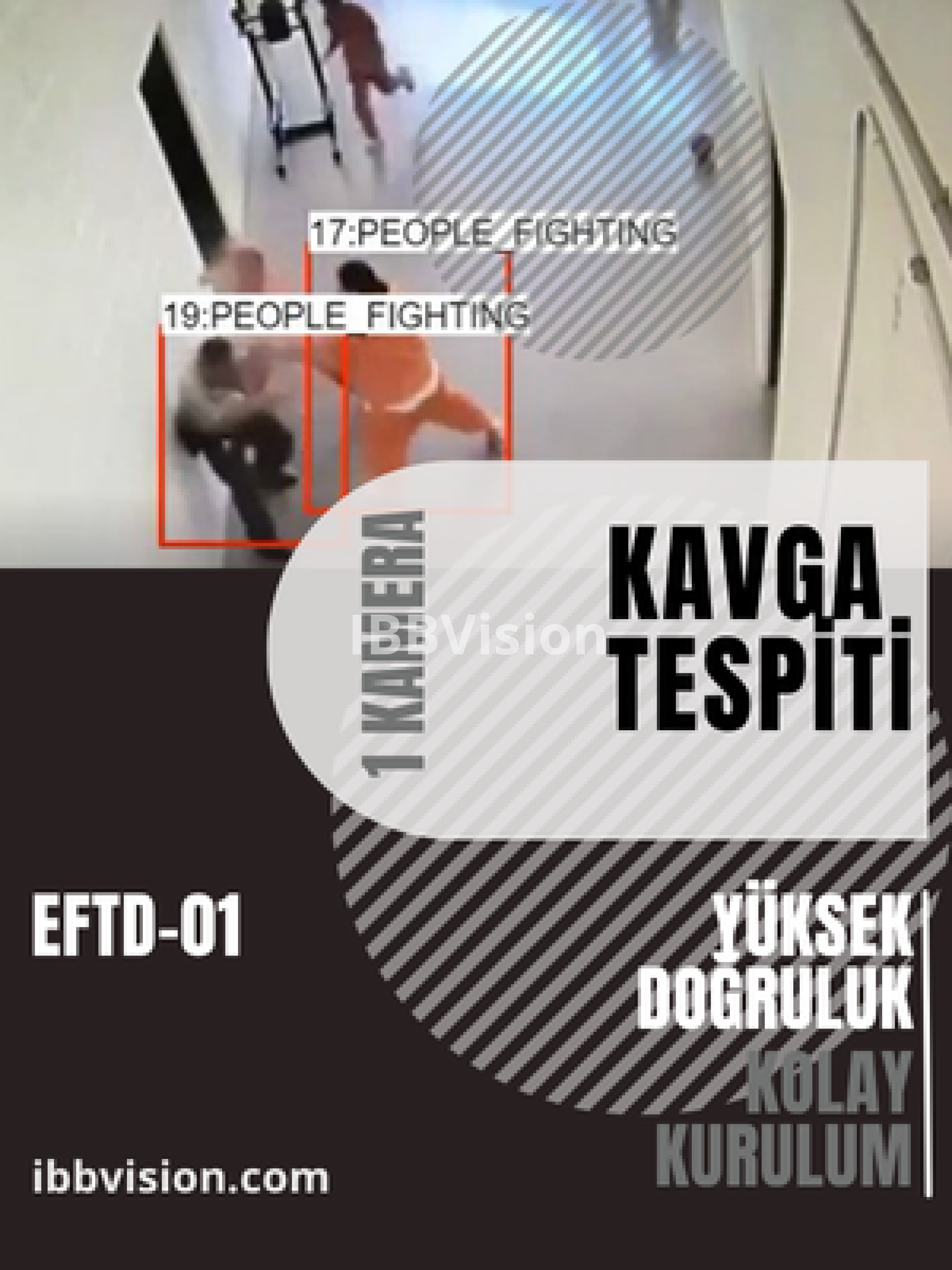 EFTD-01, kapalı ve açık alanlarda kavga, itişme, agresif hareketler, fiziksel müdahale ve potansiyel şiddet olaylarını gerçek zamanlı olarak tespit eden, Edge yapay zeka tabanlı bir video analiz yazılım modülüdür. IBBVision ekosistemi içinde çalışacak şekilde geliştirilen EFTD-01, hem tek başına bağımsız bir çözüm olarak kullanılabilir hem de daha önce tesis edilmiş IBBVision ürünlerine ek bir güvenlik katmanı olarak entegre edilebilir.